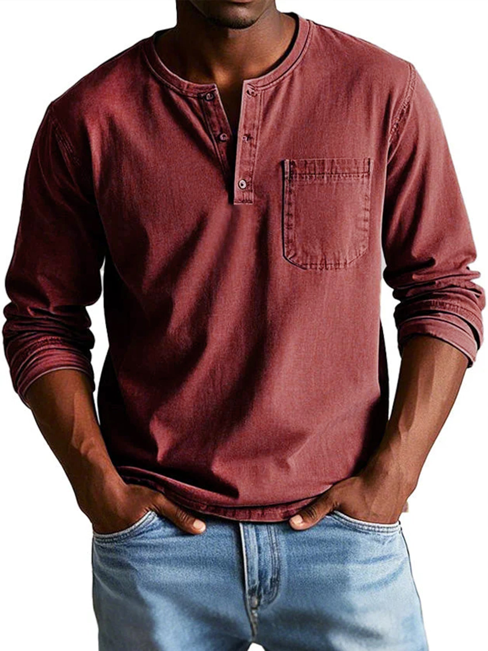 Langarmshirt – Baumwolle – Henley-Ausschnitt mit Brusttasche – Herren